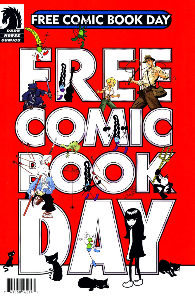 The Dark Horse FCBD comes packed with quite a few stories for a regular sized book: an Usagi Yojimbo tale, Emily the Strange, a Beanworld bloop, an Indiana Jones tale and, flipping the comic over, a Star Wars tale. Collections of shorts like this are tough. When Dark Horse collected their MySpace series, I found those great examples of how to do the short-comic collection, as it was always a mix of funny and adventurous and strange, with a good balance of ongoing tales and one-offs, with rare appearances of side stories from regular titles. Which are to be avoided, in my opinion, hence this particular free comic book not being all that great. Unless your universe lends itself to it, just giving us a glimpse of an established character is rarely enough to merit interest. So Star Wars and Indy, though obviously recognized characters, don’t connect unless you’re already interested. Emily the Strange is very much a genre book, and it ain’t my genre, but I do credit the notable art and writing style and a nice compact tale with being the right mix of qualities for this presentation. Beanworld is always insane, and this short blurb is all you need to make or break. Another good entry. And then Usagi. I love Usagi and Stan Sakai. His stories are very basic and so would seem to lend themselves to shorts like this, but they end up suffering as it only highlights the simplicity. In a feature length book, Sakai has the room to stretch out the silence or action of his stories, giving the generally simple stories room to breathe and grow into something more affecting. But compressed to a couple pages it loses impact.