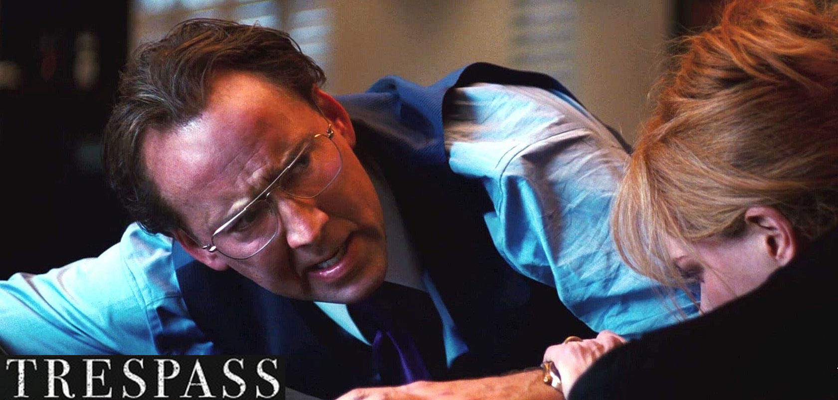 But, hey, since I don’t like Schumacher I’ll lay the blame on him: several films back Joel got ahold of a camera or lens or d.p. that he really liked and it looks good – the shots are wide and clean and the colors are all well-defined and yet not over-exposed looking. But he never does anything with it. In ‘Trespass’ Schumey stumbles across a move where a character is hit or falls down and the view switches to POV, rushing toward the floor and showing us the jarring nature of the impact. It’s a neat jolt the first time he does it, but it happens about 9,000 times after that and it just highlights the stupid, repetitive nature of everything on the screen.